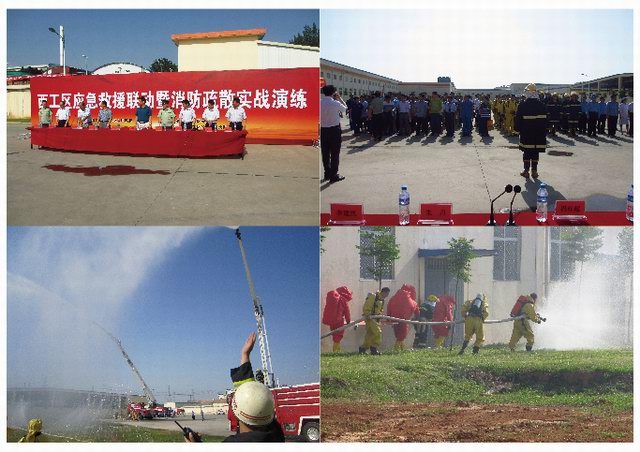 洛陽市安監局領導、洛陽市消防支隊領導、區領導迅速趕赴現場指揮救援,8臺消防車、2臺救護車在公安交警車開道下呼嘯而至,120名消氣防戰斗員訓練有素展開救援,生產調整組、安全環保組、警戒保衛組、設備搶修組、信息管理組共50人分別按預案井然有序開展現場工作。由于反應迅速,處置得當,沒有造成周圍水體、空氣環境污染,沒有發生其他次生事故,1名中毒的現場操作人員得到及時救治。本次演練為力求貼近實戰,對突發事故應急處理真正起到指導和演練作用,改變以往演練模式,應急指揮部演練中還臨時增設了演練科目。
